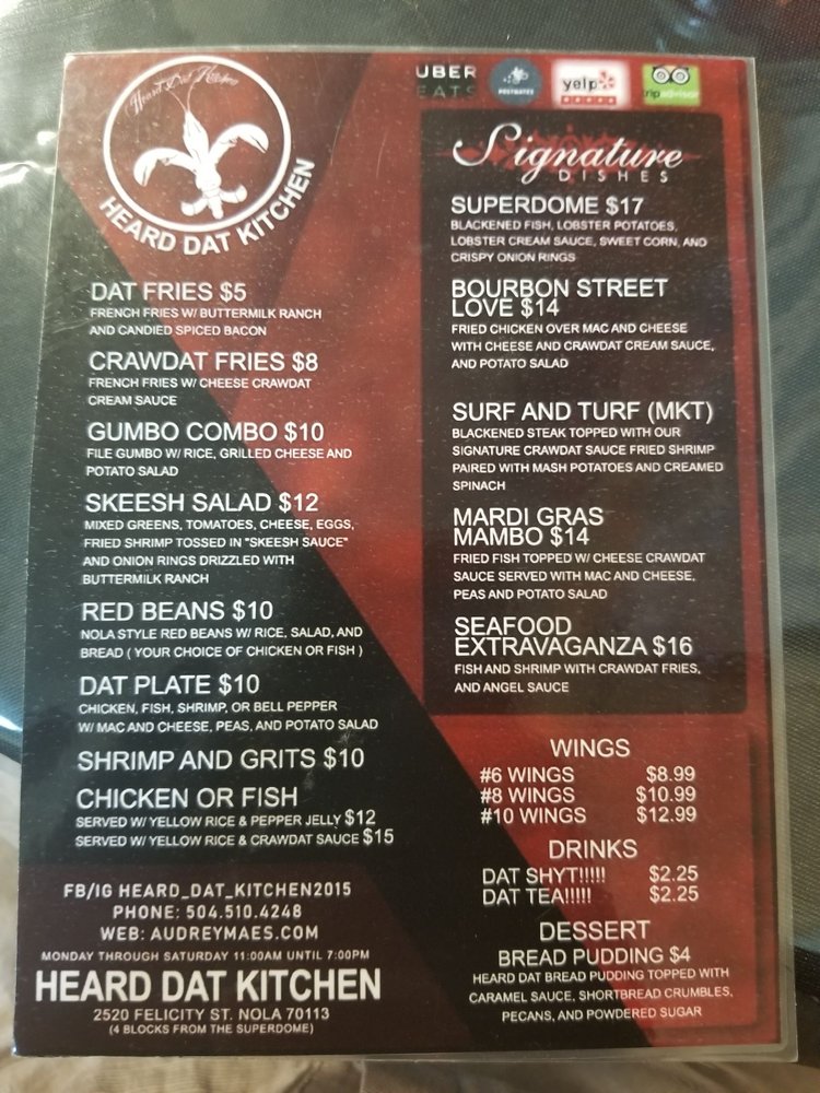 Pictures. Use your uber account to order delivery from heard dat kitchen in new orleans. Browse the menu, view popular items, and track your order.